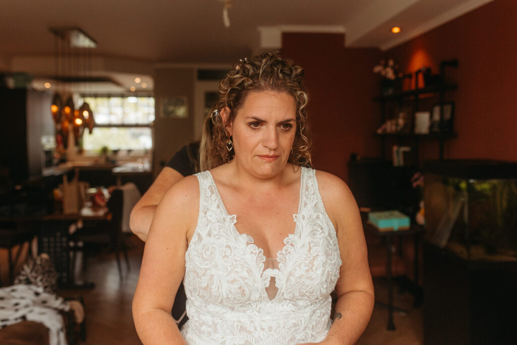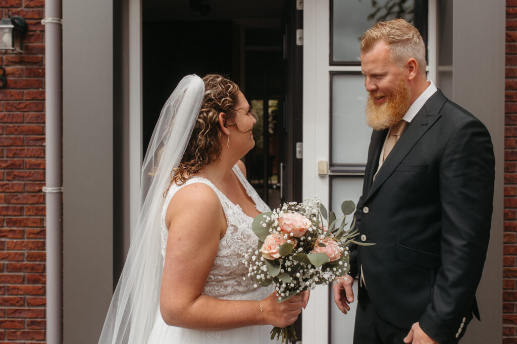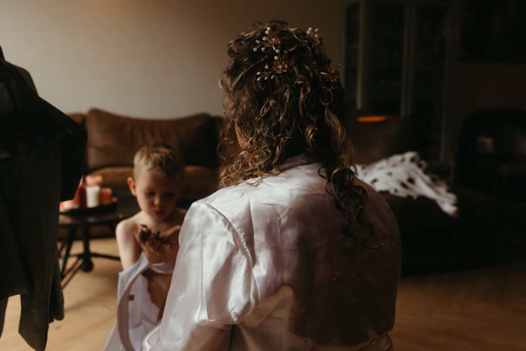 Ik liep er een beetje tussendoor. Soms met mijn camera, soms gewoon gezellig pratend aan de keukentafel. Precies zoals ik het het liefst zie: een trouwdag die ontspannen begint en gewoon echt voelt.