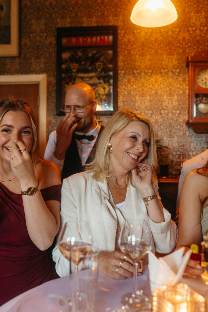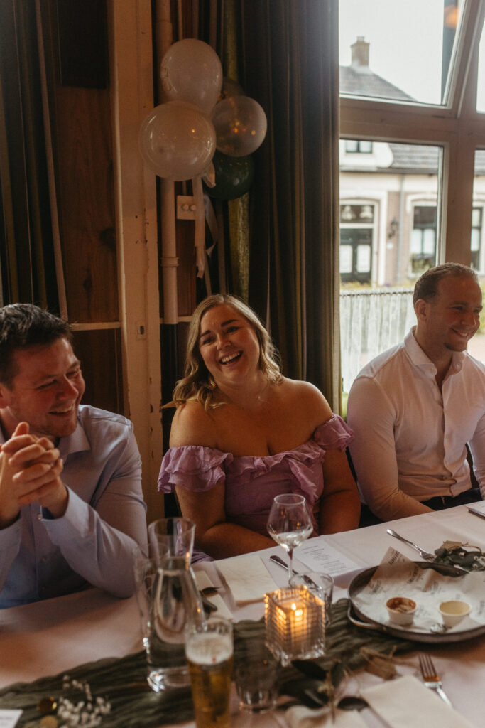 Daar stonden vrienden en familie hen al op te wachten en schoof iedereen eerst aan voor een heerlijk driegangen diner. Een ontspannen begin van de avond, waar vooral veel werd gelachen, bijgepraat en geproost.