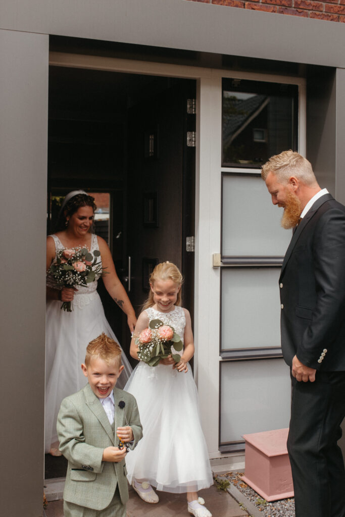 De ochtend begon bij Kim thuis, samen met haar kinderen. Geen strak schema, geen stress. Gewoon een rustige ochtend waarin iedereen zijn eigen ding deed. Kim trok haar jurk aan terwijl de kinderen rondliepen, speelden en af en toe nieuwsgierig kwamen kijken.